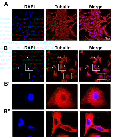 Morphology of A172 control cells (A) and A172 cells treated with A. cerefolium methanolic extract (B). Boxed regions in B are enlarged in (B’,B’’) figures. White arrowheads in B mark cells with multiple micronuclei.