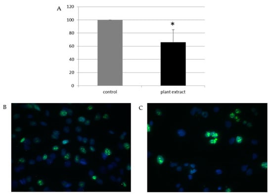 The impact of the extract on the proliferation of A172 glioblastoma cells was investigated by analyzing the expression of Ki67 protein, a marker of proliferation. Ki67 is well-known marker for determination of the proliferation of tumor; its expression is used as a prognostic marker for cell proliferation in many tumors and it has been revealed that Ki67 value predicts the response to neoadjuvant chemotherapy []. The percentage of proliferating cells (Ki-67 labeling index) can discriminate more aggressive phenotypes of tumors; currently, thus the values of Ki67 labeling index is used both to predict the prognostic stratification of patients and to estimate the responsiveness to the resistance to chemotherapy []. By Ki67 immunostaining we detected that proliferation rate of A172 cells treated with the extract was decreased by aproximately 30% compared to proliferation rate of control cells (Figure 4). Our study is the first to explore the effect of herba Anthrisci cerefolii on the properties of glioblastoma cells. The obtained results provide a good basis for further research that could explore the possibilities of applying the extract of herba Anthrisci cerefolii in the treatment of glioblastoma.