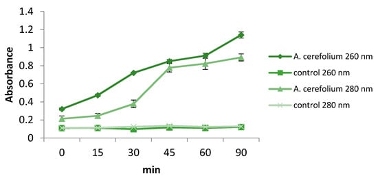 A Candida albicans strain was used for ergosterol binding and membrane permeability assays. In order to determine whether the antifungal effect of the extract was achieved via disruption of ergosterol biosynthetic pathway, serial dilutions (same as for microdilution method) of the extract were prepared with addition of ergosterol (25–100 µg/mL). After 24 h of incubation at 37 °C, MFC values were determined as explained for antifungal activity assay. The effect of A. cerefolium extract on cell membrane permeability was analyzed as described previously. The optical density of the filtrate was measured at room temperature (25 °C) at 260 and 280 nm (8453 spectrophotometer, Agilent, Santa Clara, CA 95051 United States) [].