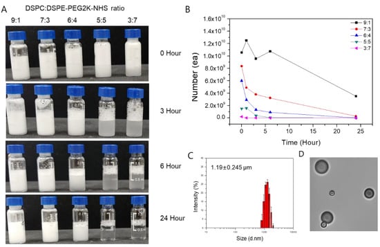 Microbubbles with different molar ratios of DSPC and DSPE-PEG2K-NHS (9:1, 6:4, 3:7, 7:3, and 5:5, respectively) were used to optimize their stability. After their synthesis, the microbubbles and IMC with different phospholipid ratios were diluted 100-fold with PBS and were counted manually under a light microscope. Measurements were made at 0, 3, 6, and 24 h post microbubble synthesis.