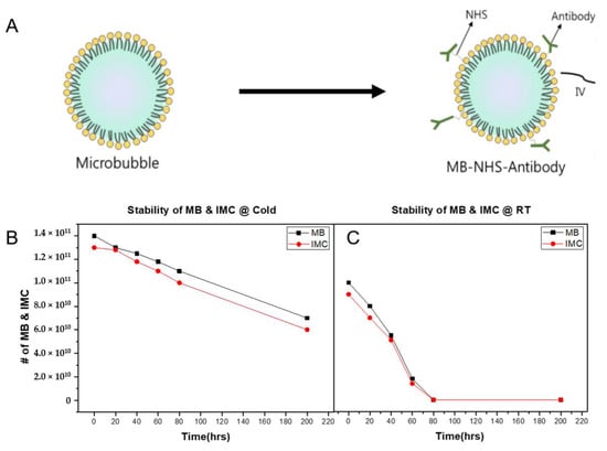 Synthesis of the immune-microbubble complex (IMC) and their stability. (A) The schematics of conjugating antibodies onto the surface of MBs using amine-NHS crosslinking. (B) The stability of the MBs and IMCs at 4 °C over 200 h. For both MBs and IMCs, up to 50% of the initial amount remained viable. (C) The stability of the MBs and IMCs decreased significantly at room temperature conditions, suggesting that higher temperature was associated with their decay.