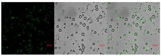 To confirm the antibody conjugation and visualize the IMCs, fluorescein isothiocyanate (FITC)-conjugated antibodies were conjugated onto the surface of MBs, similar to the protocol for conjugation of the anti-PD-L1 antibody. The fluorescence-labeled antibody-MB complex was examined with an LSM710 confocal microscope at ×1000 magnification. A strong FITC fluorescence, corresponding to the borders of the MBs in differential interference contrast images, was observed, confirming that the antibodies could be successfully conjugated onto the surface of the MBs (Figure 3).