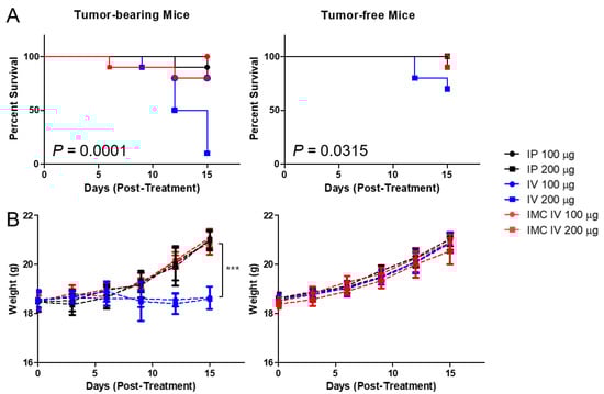 The survival analysis of anti-PD-L1 antibody administered CT26-wt tumor-bearing mice and the evaluation of the effects of the dose and different routes of administration. (A) The intravenous injection of PD-L1 antibodies at higher doses (200 μg) in tumor-bearing and tumor-free mice showed increased adverse effects, as 90% and 30% of the mice died within two weeks after injection, respectively. (B) The tumor-bearing mice that were injected with the PD-L1 antibodies intravenously at both high and low doses showed reduced weight gain, which may suggest potential adverse effects induced by these antibodies. All the other mice in both the tumor-bearing and tumor-free groups showed a steady increase in the average body weight over the two weeks. IP—intraperitoneal injection; IV—intravenous injection; Values are mean ± SD (n = 10 per group). *** p ≤ 0.001.