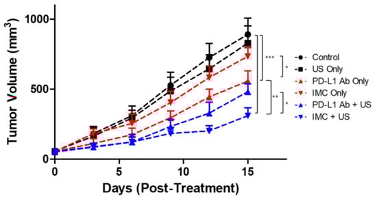 The therapeutic efficacy of PD-L1 targeting protocols against CT26 colon tumors. The control, ultrasound (US) only, and IMC only groups did not show any regression of the tumor after treatment protocols were employed. As expected, the administration of PD-L1 antibody was effective in retarding the tumor growth. The therapeutic effects were maximized with the combination of IMC with focused ultrasound treatment, from which the synergistic effects of both the enhanced localization of the PD-L1 antibody and the cavitation induced by the focused ultrasound can be expected. Values are mean ± SD (n = 5). * p ≤ 0.05, ** p ≤ 0.01, *** p ≤ 0.001.