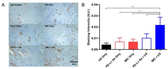 Immunohistochemical evaluation of different treatment groups. (A) Representative pictures for each treatment group after staining are presented. (B) The intensity of PD-L1 antibody staining from these pictures were analyzed using ImageJ. The staining intensity of the IgG isotype was subtracted from each group to account for the non-specific binding and background signals. Values are mean ± SD (n = minimum 3 for each group). ** p ≤ 0.01, *** p ≤ 0.001.