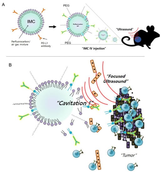 To alleviate the associated adverse effects, the presentation of active pharmaceutical ingredients in carriers such as liposomes has become a standard practice to enhance the pharmacokinetic/dynamic profiles in vivo. Doxil (liposomal doxorubicin) and Abraxane (albumin-bound paclitaxel) are two examples of such nanoformulations used in clinics that have greatly increased the therapeutic index of the parent drugs by extending their circulatory half-life and reducing the associated immunotoxicities [,,]. As such, we hypothesized that by presenting the therapeutic PD-L1 antibodies in a nanoformulation, we could expect similar improvements in the therapeutic index and avoid the immune adverse effects. IMCs have not only met these criteria to minimize adverse effects, but they also introduce an additional dimension to improve the therapeutic efficacy—the concept of cavitation-mediated drug delivery.