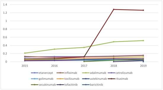 As a whole, during 2015–2019 the utilization in DDD/1000inh/day increased from 0.657 to 2.395. The increase in utilization was found to be significant (p < 0.001). Adalimumab is definitely a leader in utilization in DDD/1000inh/day accounting for 32% to 21% of total utilization during the period (Table 4). For rituximab we noted a tremendous increase in utilization in 2018 when the first biosimilar entered the market.