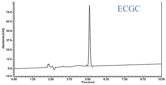 Firstly, methanol was selected as an organic modifier due to its availability and cheaper price with better peak shapes as well [25]. A mobile phase with low proportions of methanol was needed to enhance the separation parameters. A mobile phase with 75% water and 25% methanol achieved the best chromatographic characteristics for the ECGC peak with a reasonable retention time. The influence of pH of the mobile phase on the capacity factor (K′) of the ECGC peak was investigated in order to optimize HPLC parameters. The impact of pH was investigated using potassium dihydrogen phosphate buffer at a pH range of 3–6. pH 3 was chosen in order to improve the ECGC peak shape and to minimize its accompanied asymmetry. Eventually, a flow rate of 1 mL/min at an ambient temperature was selected to permit better elution time and reasonable peak separation from the combined matrix components with UV detection at 280 nm. The HPLC chromatogram exhibited a sharp peak with obvious baseline separations, Figure 1. The average retention time for ECGC was found to be 5.14 ± 0.12 min, for seven replicates.