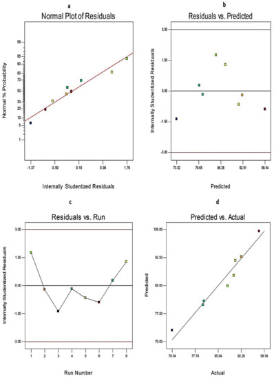 The diagnostic plots for EE% of EGCG-loaded spanlastics (a) plot of normal % probability versus the internally studentized residuals, (b) plot of the internally studentized residuals versus the predicted values, (c) plot of the internally studentized residuals versus the run number, and (d) plot of the predicted versus the actual values of EE%. Abbreviation: EE, entrapment efficiency of EGCG-loaded spanlastics.
