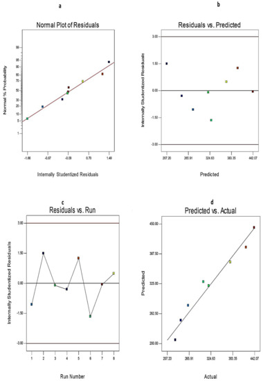 Additionally, the credibility and the goodness of fit of the current model were investigated from the diagnostic plots for EE%, Q12h, and PS of EGCG-loaded SNVs, Figure 2 and Figure 3, respectively. The difference between the actual and predicted values of the three responses was denoted as the residuals. Figure 2a, Figure 3a, and Figure 4a explore the normal probability plots of residuals as a linear pattern with a normal distribution of the residuals. Therefore, the data require no transformation. Figure 2b, Figure 3b, and Figure 4b demonstrate a plot of the residuals versus the predicted responses and show the absence of constant error because the color points, representing the values of different responses, were located within the limits near to the zero-axis and scattered randomly. Figure 2c, Figure 3c, and Figure 4c describe the residual versus run plots and exhibit a random and uniform scattering of points. Hence, no lurking variables affect the tested responses. Figure 2d, Figure 3d, and Figure 4d investigate the excellent analogy between the predicted and the observed values of Y1, Y2, and Y3 of EGCG-loaded SNVs in the present model.