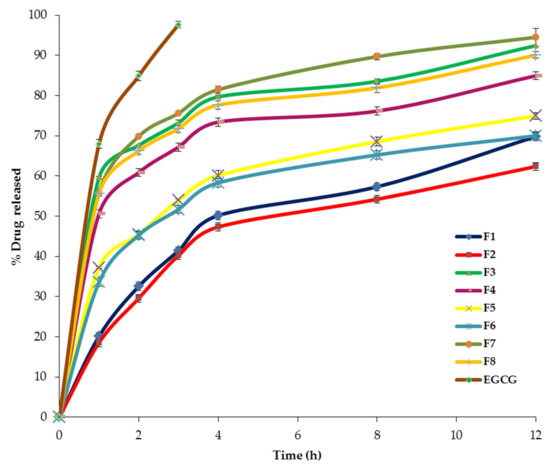 The eight EGCG-loaded spanlastic formulations demonstrated a sustained release profile that varied from 62.39 ± 2.14% to 94.52 ± 1.07% after 12 h (Figure 6, Table 1). These findings explored that the nanospanlastic vesicles act as perfect reservoirs for EGCG [40]. However, the free EGCG exhibited a higher % drug released of 97.68 ± 1.33% after 3 h. That might be attributable to attaining successfully the sink conditions and the absence of hampering the in vitro release of EGCG by the cellulose membrane [41]. These outcomes agreed with Badria et al. [23], who demonstrated that sodium valproate-loaded spanlastics showed a more prolonged drug release than the free drug. Besides, Li et al. [27] reported that the in vitro release of EGCG-loaded niosomal formulations was more sustained than the free drug. Additionally, Safwat et al. [42] demonstrated that free EGCG diffused rapidly throughout the dialysis membrane. By contrast, EGCG-loaded gold nanoparticles exhibited sustained drug release for a prolonged period of time.