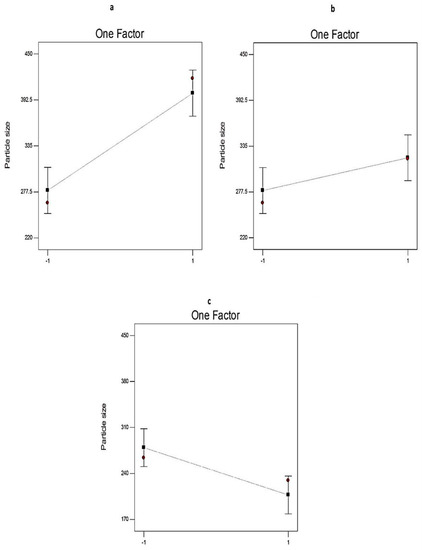The influence of different independent variables (X1, X2, and X3) on the PS of the EGCG-loaded SNVs was investigated in Figure 8. Regarding the ratio of Span: EA (X1), the PS of the formulated EGCG-loaded nanovesicles decreased significantly (p < 0.01) upon increasing the concentration of EA. That may be attributable to facilitating the partition of particles as a result of reducing the interfacial tension at higher concentrations of EAs [49].