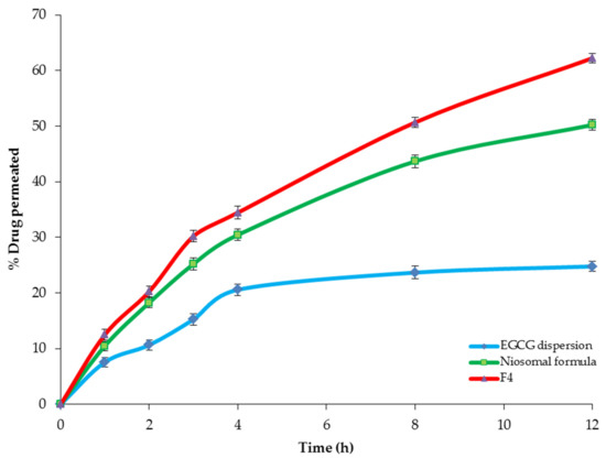 The kinetic analysis investigated that the permeation profiles of F4 and the niosomal formula followed the Baker–Lonsdale model, whereas EGCG dispersion followed the Higuchi model, Table 6.