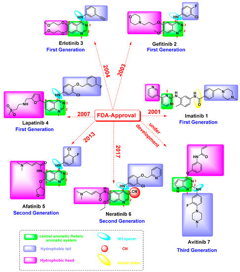 First-generation EGFR tyrosine kinase inhibitors (TKIs) such as gefitinib (2), imatinib (1), lapatinib (4), and erlotinib (3) have been approved by the US Food and Drug Administration (FDA) for treatment of EGFR-activating mutation-positive NSCLC patients (Figure 1). Acquired drug resistance, however, often occurs after approximately 12 months of treatment with gefitinib (2) or imatinib (1) [6,7]. Lapatinib (4), the first dual oral inhibitor of EGFR and HER2, was approved by the FDA in 2007 for patients with advanced or metastatic breast cancer (Figure 1). These drugs bind competitively and reversibly to the adenosine triphosphate (ATP) binding site of EGFR/HER2, achieving target selectivity by identifying unique characteristics of specific ATP-binding features [5,6,7]. Unfortunately, the ability of these EGFR inhibitors to successfully treat NSCLC is short-lived in subsequent therapies due to acquired T790M missense secondary mutations in EGFR, contributing to drug resistance in around 50% of patients. The mutation of EGFR T790M restores ATP affinity to levels close to those of wild type EGFR, preventing the first generation of TKIs from binding ATP at higher levels. To overcome this resistance, second-generation TKIs, represented by afatinib (5) (Vizimpro™, Pfizer Inc., New York, NY, USA) and neratinib (6) (Nerlynx™, Puma Biotechnology Inc.), were developed. They have been reported to be superior to first-generation EGFR TKIs in cases of EGFR mutation [6,7].