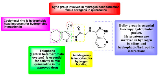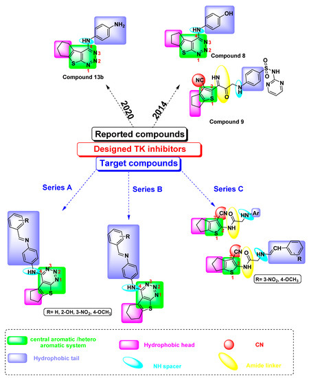 Moreover, it was observed that the structure of the majority of clinically approved TKIs is characterized by a hydrophobic head and hydrophobic tail linked to a central heteroaromatic system and NH spacer, as shown in Figure 1. A literature survey based on the leading dual EGFR/HER2 targeting compounds lapatinib (4) and neratinib (6) shows that the upper right warhead, or the hydrophobic tail, is essential for potency of kinase inhibition, while the lower left warhead, the hydrophobic head, is crucial for the dual EGFR/HER2 inhibitory activity. Therefore, to design dual TKIs, we kept the 4-aminoaniline with modified substitution at the meta position as the upper right warhead. On the other hand, the lower right warhead serves as an electrophilic moiety for covalent bond formation in the majority of second- and third-generation agents, and owing to the limited clinical benefit and toxicity, the left warhead was modified in the current study to cyclopentyl and/or cyclohexyl (series A and B) in an attempt to abolish the cytotoxicity. In addition, the hinge region of TKIs, which is occupied by the adenine ring of ATP, was modified to be occupied by thienotriazine in series A and B, and tetrahydrobenzothiophene in series C. Modification of the core scaffold was intended to diminish the cellular resistance common with quinazoline and improve the potency based on our previous publication. Another new modification in this study is a change in the position of the upper warhead from position 4 of quinoline and quinazoline in the majority of approved TKIs to position 2 of tetrahydrobenzothiophene, keeping the hydrophobic tail to mimic the dual EGFR/HER2 inhibitors. The cyano group, which is characteristic of neratinib (6), was kept at position 3 to mimic N3 of quinazoline-based TKIs. In this way, various regions of ATP-binding sites could be targeted by such substitution patterns on the mutant EGFR protein kinase domain to design molecules that are differentially selective. The design strategies are displayed in Figure 1 and Figure 2.