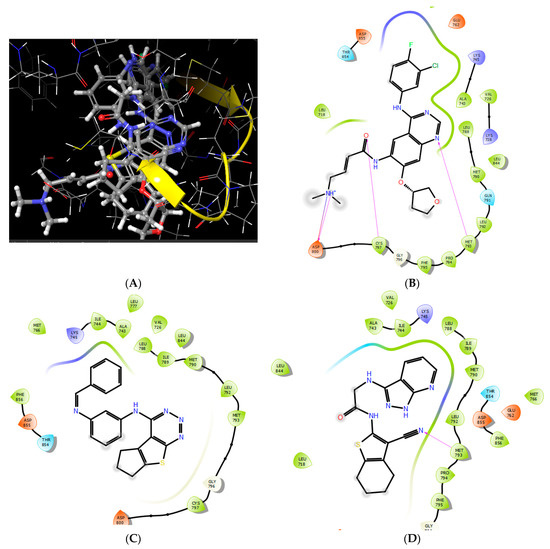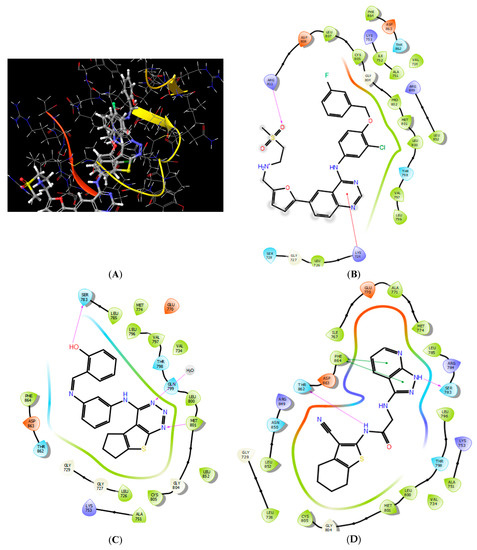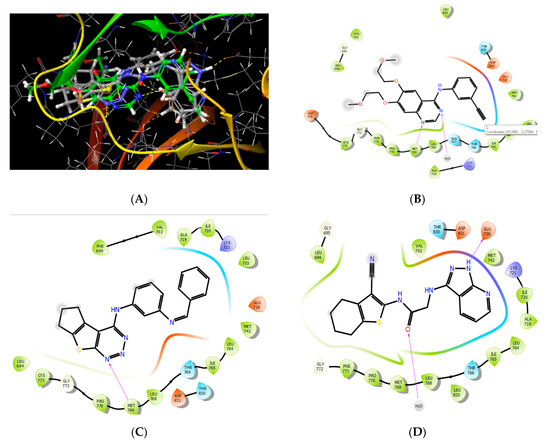 Computer-aided simulation of drug design saves effort, time, and energy compared to conventional methods of drug production. Molecular-based drug design was proposed in order to predict the possible interactions of the target compounds with EGFR/HER2. Using Glide in the Schrodinger program for docking, the modulation activity of erlotinib (3) and afatinib (5) derivatives against the EGFR/HER2 receptor was determined, as shown in Figure 4. The designed compounds were docked into the ATP-binding pocket as a thienotriazine and tetrahydrobenzothiophene scaffold, mimicking the ATP adenine ring occupying the hinge region motif of TKs. The positions of thienotriazine (14a), tetrahydrobenzothiophene (21a), erlotinib (3), and afatinib (5) were similar, which implies that they might share the same biological activity. The docking results show, in detail, that the designed TKI formed hydrogen bonds, hydrophobic contacts, and hydrophobic–hydrophilic interactions with the target TKs. N1 of the triazine motif in series A and B could act as a hydrogen bond acceptor and form hydrogen bonds with MET769 (distance 2.4 Å, angle 143.6) in the hinge region, mimicking the N1 of quinazoline in the approved drug erlotinib (3) (distance 2.2 A, angle 135.7). In series C, a tetrahydrobenzothiophene scaffold occupied the hinge region in the same position of quinazoline, forming a hydrogen bond with crystal water, mimicking the N3 of erlotinib’s quinazoline. The phenyleneimine and pyrazolopyridine moieties deeply penetrated the hydrophobic pocket, forming hydrophobic–hydrophobic, Van der Waals, and π–π interactions with key amino acids such as ALA719, ILE720, MET742, LEU753, and LEU764, mimicking the phenylacetylene of erlotinib (3). Modifying these moieties, such as by adding hydroxy, nitro, or methoxy groups, could enhance affinity through the formation of hydrogen bonds with GLU738 and LYS721. The incorporation of CN at position 3 of tetrahydrobenzothiophene could confer series C with a certain superiority by forming hydrophobic interactions with LEU694 and VAL702. Extra precision glide docking of compounds (14a) and (21a) with the active domain of EGFR showed reasonable docking scores of −6.78 and −7.69 and glide E-model values of −64.6 and −71.2 kcal mol−1, respectively.