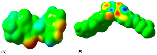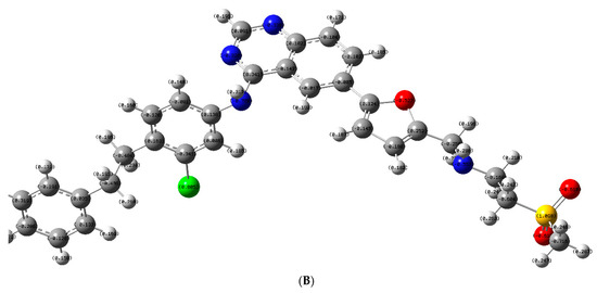 Molecular electrostatic potential mapping for (A) the most potent compound (21a) and (B) lapatinib (4) from density functional theory (DFT) calculations. Green indicates zero potential regions, blue indicates electropositive regions, and red indicates electronegative regions.
