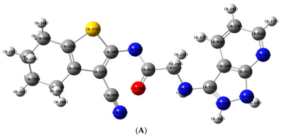 Moreover, the Mulliken atomic charges (Figure 8) are in agreement with the MESP results. The negative charge is mainly located on nitrogen atoms of the quinazoline of lapatinib (4) and on the cyano group and nitrogen of the amide link and nitrogen atoms of pyrazolopyridine in the most potent compound (21a). The highest negative charge in both lapatinib (4) and the representative compound give this atom the highest reactivity in the interaction with EGFR and HER2 receptors.