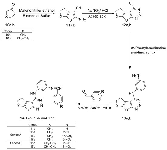 Synthesis of dihydrocyclopentathienotriazine and tetrahydrobenzothienotriazine derivatives (series A, B).