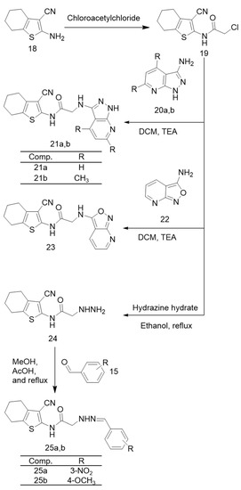 The synthetic methods for series compounds A/B and C were illustrated in Scheme 1 and Scheme 2. Compounds (11–13) were synthesized as reported in our earlier research [16]. Series A and B compounds were obtained by condensation of compounds (13a,b) with different aromatic aldehydes (Scheme 1) [17]. Scheme 2, involving the synthesis of series C, started with the reaction of 2-amino-5,6-dihydro-4H-cyclohexa[b]thiophene-3-carbonitrile (18) with chloroacetyl chloride to yield compound (19). Then, coupling of compound (19) with heteroaryl amines (20a,b and 22) [18] and hydrazine hydrate gave compounds (21a,b), (23), and (24) respectively [19]. The hydrazide derivative (24) was condensed with different aromatic aldehydes, yielding compounds (25a,b) [17].
