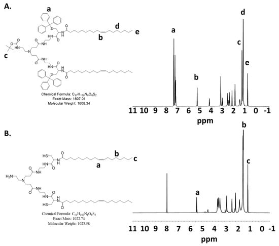 The last deprotection step of pECO to ECO was performed in an ice bath to avoid the oxidation of thiols to form intramolecular disulfide bonds or react with the double bonds in the oleyl groups. The final product ECO was purified by using FLASH chromatography. The fractions containing the ECO were identified by using Ellman’s reagent and confirmed by MALDI-TOF mass spectrometry. The ECO could present as a protonated and unprotonated version and appear in two peaks. The purified ECO was dissolved in water and lyophilized, and then quickly dissolved in ethanol to a 50 mM stock concentration to prevent oxidation of thiols and for nanoparticle formulations with nucleic acids. The final product ECO had a high purity and good solubility in ethanol. Figure 1 shows the 1H-NMR spectra of pECO and ECO. The HPLC chromatograms and mass spectra of pECO and ECO are shown in Supplemental Figures S3 and S4.