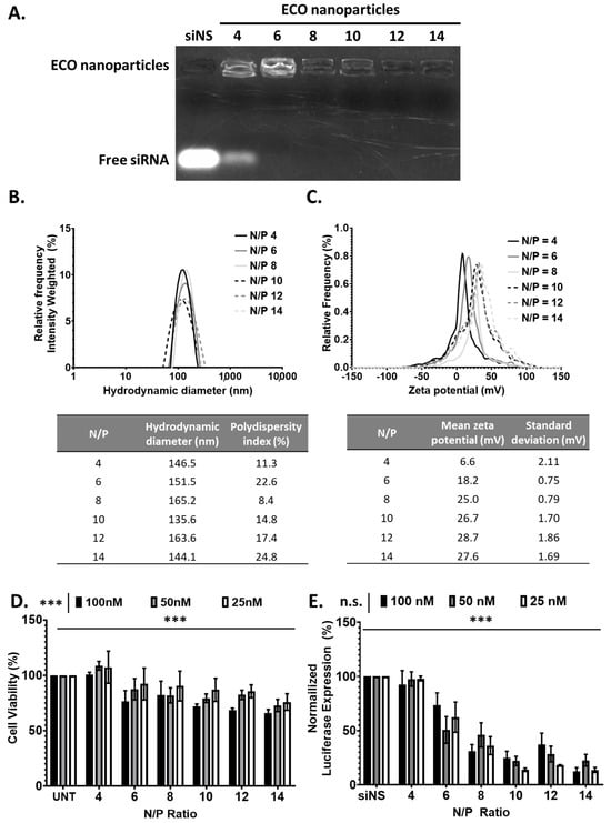 The ECO/siLuc nanoparticle characterization. (A) The electrophoresis of ECO/siLuc nanoparticles at various N/P ratios. (B,C) The hydrodynamic diameter and zeta potential of the ECO/siLuc nanoparticles at N/P ratios 4, 6, 8, 10, 12, and 14. (D) ECO/siNS viability at varying N/P ratios after 48 h post transfection. (E) Luciferase silencing of ECO/siLuc nanoparticles 48 h post transfection. The bars indicate mean ± s.e.m. *** p < 0.005 using two-way ANOVA.