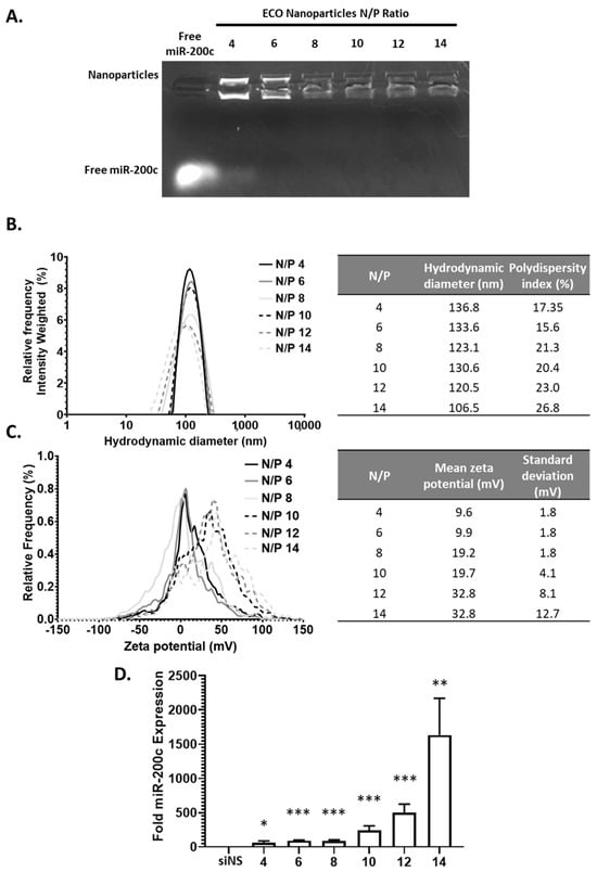 The ECO/miR-200c nanoparticle characterization and transfection. (A) The electrophoresis of ECO/miR-200c nanoparticles at N/P ratios 4–14. (B,C) The hydrodynamic diameter and zeta potential of the ECO/miR-200c nanoparticles. (D) The miR-200c levels after 48 h of ECO/miR-200c nanoparticles transfection in MDA-MB-231 cells. The bars indicate mean ± s.e.m. * p < 0.05, ** p < 0.01, and *** p < 0.005 using an unpaired t-test.