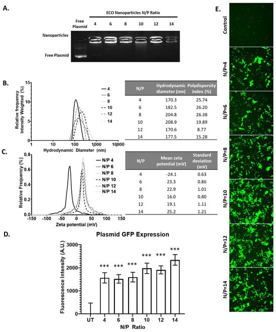 Finally, we characterized the ECO formulation using a plasmid DNA encoding GFP reporter gene (pCMV-GFP). The overall plasmid encapsulation efficiency of the plasmid with the ECO was evaluated through gel retardation assay. Across all N/P ratios of the ECO/pCMV-GFP nanoparticles, no ethidium bromide signal was observed for free plasmid. Compared to siRNA and miRNA formulations, characterization of nanoparticles revealed no trends with increasing N/P ratios, including the signal intensity (Figure 4A). These characteristics may indicate that the ECO and large plasmid DNA form tightly packed nanoparticles even at low N/P ratios as compared to the smaller counterparts, siRNA and miRNA. Upon further characterization with DLS, the ECO/pCMV-GFP nanoparticles’ hydrodynamic diameter ranged from 170 nm to 200 nm (Figure 4B). Ratios from N/P = 4 to N/P = 10 revealed an increasing trend in nanoparticle size from 170 nm to 209 nm; however, N/P = 12 and 14 resulted in smaller nanoparticles (ca. 170 nm). The results indicate that more compact nanoparticles might be formed with excess ECO. The zeta potential of these plasmid nanoparticles followed a similar trend to siRNA, where the overall zeta potential ranged from −25 mV to 25 mV (Figure 4C). N/P = 4 nanoparticles displayed a −24.1 mV zeta potential, while N/P ≥ 6 expressed a positive zeta potential.