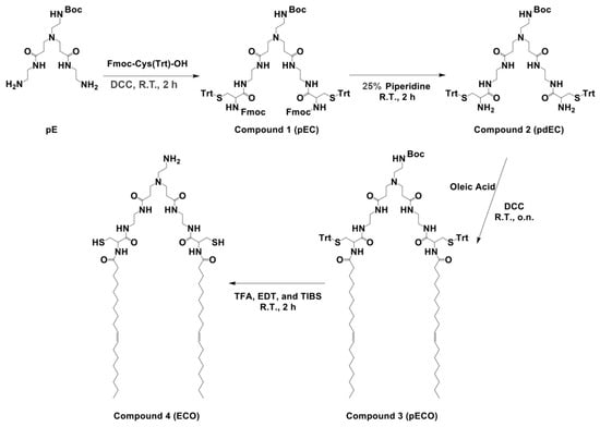 In a round bottom flask, N,N′-Dicyclohexylcarbodiimide (DCC) (2.0 g, 6.1 mmol) and Fmoc-Cys(Trt)-OH (7.5 g, 12.9 mmol) were dissolved in 40 mL of THF. In a separate flask, tert-butyl (2-(bis(3-((2-aminoethyl)amino)-3-oxopropyl)amino)ethyl)carbamate (pE) (1 g, 2.6 mmol) was dissolved in 20 mL of THF and added dropwise to the reaction flask. The solution was allowed to react for 2 h at RT, and the DCU precipitate was removed by filtration. The THF was removed by rotary evaporation under a vacuum until completely dry. The DCM (60 mL) was added to the crude product and poured into a separatory funnel. Sixty mL of 5% Na2CO3 aqueous solution was added to wash the DCM layer 3 times. The DCM fraction was collected by phase separation and was dried using sodium sulfate and filtered with grade 2 V folded qualitative filter papers (Cytiva, Marlborough, MA, USA). The DCM was removed by rotary evaporation under a vacuum to dryness. The residue was dissolved in 5 mL of DCM, and solids were removed. The product was then precipitated in excess diethyl ether and allowed to dry to obtain the final product bis((9H-fluoren-9-yl)methyl) (13-(2-((tert-butoxycarbonyl)amino)ethyl)-5,10,16,21-tetraoxo-1,1,1,25,25,25-hexaphenyl-2,24-dithia-6,9,13,17,20-pentaazapentacosane-4,22-diyl)dicarbamate (pEC, 3.0 g, 76%). 1H-NMR (500 MHz, MeOD) δ 7.54 (16H, C=CH), 7.18 (d, J = 7.6, 12H, CH), 7.07 (t, J = 7.7, 12H, CH), 6.95 (t, J = 7.3, 6H, CH), 4.42 (q, J = 9.8, 2H, HC-CON), 4.31 (d, J = 9.1, 4H, HC-OOC), 4.15 (t, J = 9.7, 2H, CH), 3.26 (12H, N-CH, CON-CH), 3.12 (t, J = 6.5, 2H, N-CH), 2.69 (t, J = 6.5, 4H, HC-S), 2.61 (q, J = 6, 2H, CON-CH), 2.31 (t, J = 6.7, 4H, HC-CON), 2.00 (q, J = 6.7, 8H, HC-C=C), 1.65 (p, J = 7.0, 4H, CH2-C), 1.41 (s, 9H, CH3-C). MALDI-TOF MS m/z calculated for C91H94N8O10S2 (M + 1) 1523.92, found m/z 1523.64; calculated for C91H94N8O10S2 Na (M + Na) 1545.92, found m/z 1546.67; calculated for C72H80N8O10S2 of one less trityl group (M + 1) 1281.60, found 1281.56; calculated for C72H80N8O10S2 Na (M + Na) 1303.56, found m/z 1304.59.