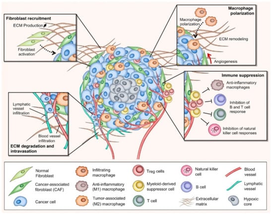 In the past decade, tremendous progress in understanding the role of TME participating in cancer development and growth has been achieved, facilitating the broadening of tumor targeting and cancer therapeutic approaches [21]. As previously mentioned, the TME comprises different types of stroma (non-malignant) cells (e.g., various phenotypes of fibroblasts, immune and inflammatory cells), ECM components, lymph nodes, nerves, and blood vessels (Figure 1). Within the TME, the interaction between tumor stroma (non-neoplastic part of the TME) and cancer cells is known to be the key parameter to direct tumor development and metastasis [22]. The activated stroma undertakes critical roles in cell invasion, extravasation, migration, angiogenesis, immunosurveillance evasion, and therapeutic resistance [23].