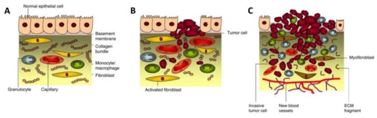 Tumorigenesis. (A) Normal epithelium with stromal compartment, including normal epithelial cells, basement membrane, macrophages, fibroblasts, and general ECM components. (B) Dysplasia; a process during tumorigenesis where the modified epithelial and stromal cells start excessively propagating and mutating due to cancer invasion. At this stage, the fibroblasts become activated, and macrophages are decreased. (C) Carcinoma; the ECM is degraded while the angiogenesis is formed to supply nutrients and oxygen to the tumor area, leading to the continual unregulated proliferation of cancer cells. The figure is reproduced and adapted with permission from [24].