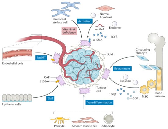 Among all the stromal cells, cancer-associated fibroblasts (CAFs) are dominant populations in the TME structure. In general, fibroblasts are quiescent and become activated during wound repair and regeneration, collectively known as myofibroblasts [35]. In the normal wound healing cycle, myofibroblasts appear in the early phase of granulation tissue formation, then become the most abundant cell type in the proliferation phase before progressively disappear in the later stage of the wound healing by apoptotic mechanism [36]. Malignant tumors are conversely recognized as “wounds that do not heal” [37,38], prompting the activated fibroblasts (CAFs in this case) to become an excellent target for cancer treatment [39]. Several recent studies have revealed the critical participation of CAFs in cancer progression as well as modulation of an antitumor immune response [34,40,41,42]. In tumor stroma, CAFs appear as spindle-shaped cells widely distributed in most connective tissues and responsible for establishing and remodeling the ECM architecture. Although the exact origin, subtypes, and biology of CAFs are not well defined due to their heterogeneity and enigmatic cellular components [38,43], increasing investigation of CAFs in cancer indicates their significance in tumorigenesis, especially in solid tumors [34]. CAFs establish a host response to neoplastic transformation and present dynamic pro- and anti-tumorigenic features during cancer progression. They also exhibit similar functions as fibrosis-associated fibroblasts, such as epigenetic programing [44]. Due to their heterogeneity, CAFs can be recruited and activated through different biological pathways from various cellular sources (Figure 3), for instance, normal fibroblasts, bone marrow-derived fibrocytes (BMDFs), mesenchymal stem cells (MSCs), endothelial cells, epithelial cells, pericyte, smooth muscle cells, and adipocytes [45]. Within the local source (i.e., TME), cancer cells can induce the activation of those recruited normal resident fibroblasts into CAFs through the release of miRNA, exosome, and transforming growth factor-β (TGFβ). Various studies have demonstrated that quiescent pancreatic and hepatic stellate cells appear to have a myofibroblast-like phenotype upon activation, which means they are considered as CAFs in pancreatic and liver cancers [46,47,48].