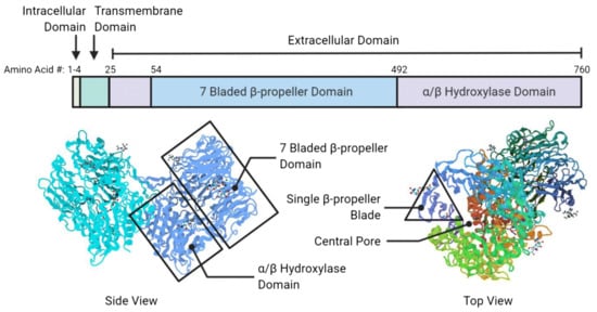 Fibroblast activation protein alpha (FAPα or FAP), also known as prolyl endopeptidase FAP or seprase, is a type II membrane-bound serine protease (97 kDa subunit) associated with fibrosis, tissue repair, inflammation, and ECM degradation [57]. Importantly, FAP is highly expressed in CAFs, a major constituent of tumor stroma, and is upregulated in more than 90% of human epithelial cancers [61,62]. Due to this reason, FAP is widely recognized as a crucial biomarker to identify potential CAF-positive tumor stroma. FAP contains 760 amino acids in its structure in which residues 1–4 are in the intracellular domain, residues 5–25 in the transmembrane domain, and residues 26–760 in the extracellular domain (Figure 4). Within the extracellular domain, the β-propeller domain comprises the amino acid residues 54–492 (i.e., substrate selectivity gate) while the residues 26–53 and 493–760 belong to the α/β hydroxylase domain [13,63].