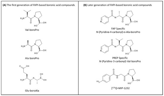 The first generation of FAP inhibitors was developed based on dipeptide boronic acid inhibitors (Figure 5). Val-boroPro and D-Ala-boroPro have been proved to be highly potent against DPPIV and can be combined with the selectivity to DPP8 and DDP9 in vivo, providing a relatively high therapeutic index above 500 in mouse models [106]. However, the biological behavior of these inhibitors has been hampered due to the lack of their selectivity towards FAP over dipeptidyl peptidases (DPPs) and prolyl oligopeptidase (PREP). In the subsequent work, D-Ala-boroPro was further modified at the amine residue, forming N-(Pyridine-4-carbonyl)-D-Ala-boroPro (ARI-3099). ARI-3099 demonstrated low nanomolar potency (IC50~36 nM) and high selectivity for FAP (350-fold over PREP), with negligible potency for DPPs in murine FAP (mFAP) transfected human embryonic kidney (HEK) 293 cells [100]. Furthermore, the boronic acid-based FAP inhibitor (MIP-1232) was synthesized and labeled with 125I [107]. [125I]I-MIP-1232 showed high accumulation in FAP-positive SK-Mel-187 melanoma cells and trivial in an NCI-H69 cell line with low FAP expression. However, the chemical stability and reactivity of boronic acid-based FAP inhibitors towards FAP enzymes are still ambiguous and not well characterized [108].