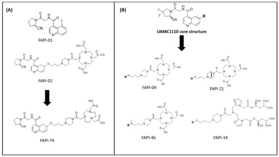 Examples of FAPI molecules developed by the Heidelberg group. (A) The first generation of FAPIs (FAPI-01 and FAPI-02) and subsequent work on FAPI-74 using the same FAP-targeting moiety conjugated NOTA chelator. (B) Relevant FAPI molecules based on UAMC1110 scaffold, including FAPI-04, FAPI-21, FAPI-34, and FAPI-46.