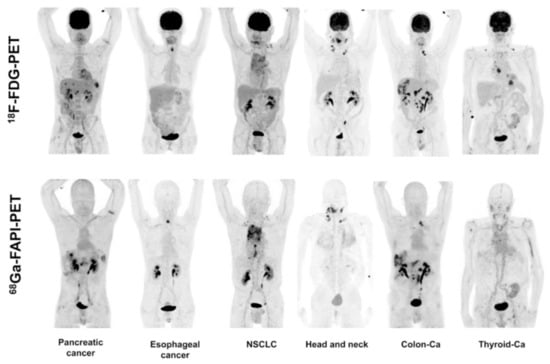 Whole-body PET/CT scans of six selected patients with different tumors entities imaged with [18F]FDG and [68Ga]Ga-FAPI-02 in the range of a 9-day imaging interval. NSCLC: non-small cell lung cancer; Ca: cancer. The figure is originally published in JNM by Giesel et al. 68Ga-FAPI PET/CT: Biodistribution and Preliminary Dosimetry Estimate of 2 DOTA-containing FAP-Targeting Agents in Patients with Various Cancers. J Nucl Med. 2019; 60:386–392. © SNMMI [124].
