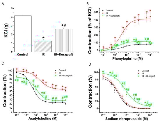 Effect of DuraGraft® on vascular contractile and relaxation responses after ischemia/reperfusion (IR) injury. Contractile responses (A) to high K+-induced depolarization and (B) phenylephrine (expressed as percentage of the maximum contraction induced by 80 mM potassium chloride (KCl), and (C) acetylcholine-induced endothelium-dependent- and (D) sodium nitroprusside-induced endothelium-independent vasorelaxation of isolated aortic rings. Results are represented as mean ± SEM. * p < 0.05 versus control; # p < 0.05 versus IR. n = 21–36 aortic rings from 7–9 rats/group.