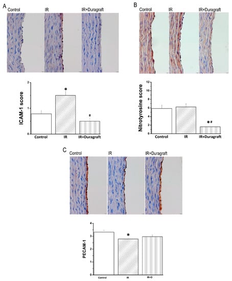 Effect of DuraGraft® on aortic intercellular adhesion molecule (ICAM)-1, nitrotyrosine, and platelet endothelial cell adhesion molecule (PECAM)-1 expression after vascular ischemia/reperfusion (IR) injury. Semi-quantitative scoring of (A) ICAM-1, (B) nitrotyrosine, and (C) PECAM-1 immunohistochemical staining and representative micrographs (×400, scale: 10 µm). Results are represented as mean ± SEM. * p < 0.05 versus control; # p < 0.05 versus IR. n = 24–28 aortic rings from 6–7 rats/group.