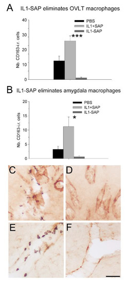 Effects of intracerebroventricular IL-1ß-saporin conjugate administration on brain perivascular cells in the organum vasculosum laminae terminalis (OVLT; A,C,D) and amygdala (B,E,F). In these structures, the IL-1ß-saporin conjugate reduced the number of CD163 immunoreactive (CD163 i.r.) cells (A–F) without affecting labelling for the endothelial cell marker von Willebrand factor (C,D) and the astrocyte marker glial fibrillary acidic protein (E,F). Brown labeling indicates von Willebrand factor (C,D) and glial fibrillary acidic protein (E,F) and black staining CD163. * p < 0.05; *** p < 0.001. IL1-SAP compared to IL1 + SAP group. IL1: interleukin-1ß; IL1-SAP: interleukin-1ß conjugated to saporin; IL1 + SAP: interleukin-1ß not conjugated to saporin; PBS: phosphate-buffered saline; SAP: saporin. Group sizes: n = 5–9. Scale bar represents 100 µm.