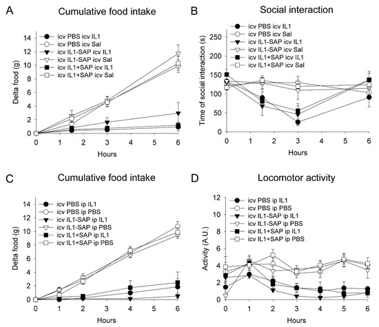 Effects of intracerebroventricular IL-1ß-saporin conjugate administration on subsequent IL-1β-induced sickness behavior. Intracerebroventricular pre-treatment with IL-1β-saporin conjugate did not affect the reduction in food intake and social interaction after intracerebroventricular IL-1ß administration (A,B). Intracerebroventricular administration of IL-1β-saporin conjugate did not affect the reduction in food intake and locomotor activity to subsequent intraperitoneal IL-1ß injection (C,D). IL1: interleukin-1ß; IL1-SAP: interleukin-1ß conjugated to saporin; IL1 + SAP: interleukin-1ß not conjugated to saporin; PBS: phosphate-buffered saline; Sal: saline; SAP: saporin. Group sizes: n = 5–9.