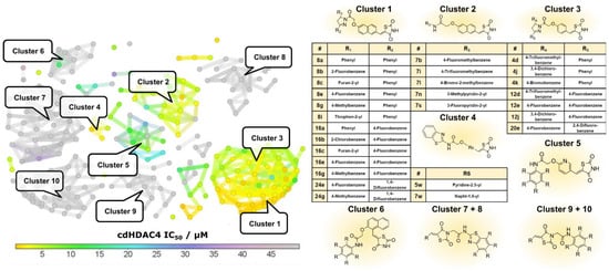 Similarity map for structural activity relationship analysis for 225 TZD containing compounds. The similarity map revealed ten clusters with varying inhibitory potencies towards cdHDAC4wt. Marker color and connecting lines highlight inhibitory activity and similarity pairs, respectively. Filled gray circles represent inactive TZD ligands with IC50-values > 50 µM.