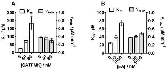 Michaelis Menten parameters for the determination of the mode of action with increasing compound concentration. Km- and Vmax-values of (A) SATFMK and (B) TZD ligand 5w showed increasing and stagnating values, respectively, as expected for a competitive inhibitor. Shown data represent means and standard deviations, N = 3.
