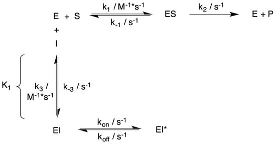 where K1 is the rapid equilibrium constant of an initial enzyme and inhibitor encounter complex kon and koff are the respective isomerization constants and I is the inhibitor concentration.
