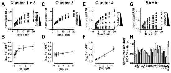 Binding kinetics of potential drugs are crucial for in vivo activity []. Therefore association kinetic measurements based on Michaelis Menten enzyme kinetics (Figure 3) were performed for selected compounds including 15 representative TZD ligands (4d, 5w, 7i, 7s, 7w, 8a, 8b, 8c, 8g, 8i, 12j, 16b, 16c, 16g, and 24g) from structural clusters 1–4 having IC50-values under 2 µM towards cdHDAC4wt. The kinetic progression curves revealed a slow association behavior of all tested compounds (Table 1 and Figure 4A,C,E). The association kinetics did not reveal significant differences between clusters 1 and 3 (4d, 8a, 8b, 8c, 8g, 8i, 12j, 16b, 16c, 16g, and 24g). The data were analyzed by plotting the rate, kobs, by which the enzyme velocity is slowed down, versus inhibitor concentration []. All compounds from clusters 1 and 3 showed a saturating behavior of kobs with increasing ligand concentrations (Figure 4B and Figure S2). The saturating curve progression of the fitted rate values indicated a two-step mechanism, in which the first step was significantly faster than the second step. Although the tested TZD ligands of clusters 1 and 3 exhibited a certain degree of structural diversity, all compounds display similar plateaus of rate constants, suggesting that the rate was limited by conformational changes of the initially formed protein-ligand complex. Consequently, the rate constants were fitted to an induced fit kinetic model, which considers the formation of an initial encounter complex of compound and enzyme under rapid equilibrium conditions followed by a slower rate-limiting subsequent isomerization of the enzyme (Figure 3) []. The details about the application of the fitting equations for the association as well as dissociation rate calculations are described in the methods section.