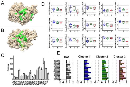 Overview of the mutational study. (A,B) are showing the substituted amino acid residues in green for the open (A) and closed (B) conformation. (C) Km values for the artificial substrate Boc-Lys{TFA}-AMC. (D) Box-Whisker-Plot showing the impact of amino acid substitution on the binding of TZD-ligands on cdHDAC4wt. (E) Average impact of amino acid substitution for the three main TZD cluster in comparison to Trichostatin A (TSA).