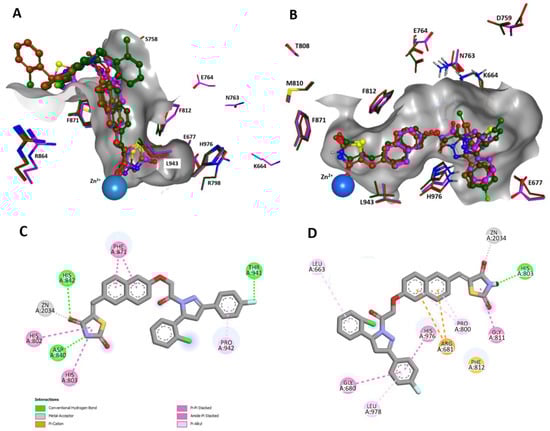 However, the location of the CAP group in HDAC4c was less defined due to the widened upper region of the binding pocket and alternative interactions with the enzyme surface (Figure 6A and Figure S8A–C). In contrast, the binding poses of TZD analogs docked into HDAC4o showed much better overlap for all ligand structures (Figure 6B and Figure S8D–F). The binding groove of the open conformation, HDAC4o, revealed an additional subpocket away from the catalytic zinc ion, which was occupied by an aromatic substituent of the dihydropyrazole CAP group of compounds in clusters 1 and 3 or the aromatic carboxamide CAP group of cluster 2 compounds (Figure 6B and Figure S10D–F).