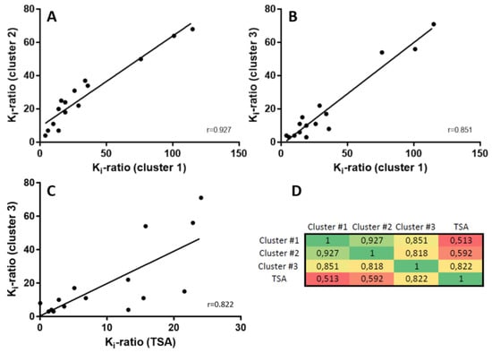 Binding profiles of TZD ligand clusters and TSA to HDAC4. Each data point represents a HDAC4-mutant, where one of the amino acids K664, E677, S758, D759, N763, E764, R798, T808, M810, F812, C813, R864, F871 or L943 is exchanged against alanine. The ratio of Ki-values for binding to a mutant variant and cdHDAC4wt indicates the impact of this specific mutation on the molecular recognition of a particular ligand. (A) Averaged Ki-ratios for binding of TZD ligand cluster 2 and (B) TZD ligand cluster 3 are plotted versus the averaged Ki-ratios of TZD ligand cluster 1. (C) The averaged Ki-ratios of TZD ligand cluster 3 is plotted versus the Ki-ratio of reference compound TSA. (D) Heat map of Spearman correlation coefficients for Ki-ratios of indicated clusters and TSA.