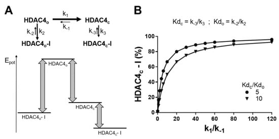 Energy diagram and simplified binding mechanism of open and closed form of cdHDAC4wt. (A) The upper panel shows a simplified binding mechanism of a ligand, I, to the open (HDAC4o) and closed (HDAC4c) conformation of HDAC4 yielding the corresponding reversible complexes HDAC4o-I and HDAC4c-I. The binding equilibria are coupled to the conformational equilibrium between HDAC4o and HDAC4c. The k-parameters denote the respective reaction rate. The lower panel shows the corresponding energy diagram, which is consistent with the conformational equilibrium shifted toward HDAC4c and larger binding energy for the HDAC4o-I complex than for HDAC4c-I. (B) Simulation of percentage HDAC4c-I as a function of the ratio of HDAC4c to HDAC4o in terms of k1/k−1. Two cases are simulated: Ligand I has 5-times (filled circle) or 10-times (down-triangle) higher affinity for HDAC4o than for HDAC4c.