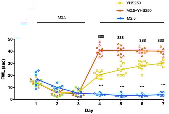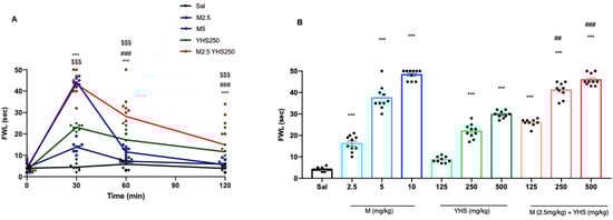 To establish the antinociceptive effects of YHS and morphine in combination on acute pain, foot withdrawal latency (FWL) in the hot plate assay was measured 30, 60, and 120 min after injections, as well as before to establish a baseline on day 1 at 52 degrees Celsius. A hotplate assay was performed, as described in the literature [22,23]. The cutoff time for the hotplate assay was 50 s.