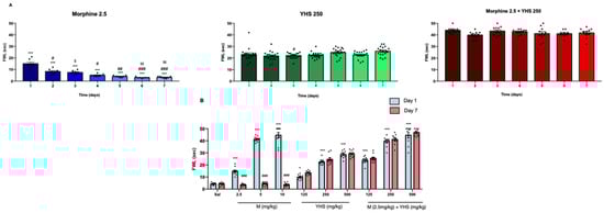 Tolerance was assessed by injecting morphine, YHS, or a combination of both twice daily for 6 days. As shown in Figure 2A and Figure S1, morphine (2.5 mg/kg) lost its antinociceptive activity over the seven-day period while analgesic effects of YHS (250 mg/kg) were retained. Moreover, when combined, YHS was able to completely prevent tolerance development to any morphine dose tested, while retaining the additive antinociceptive effect of the combination (Figure 2B).